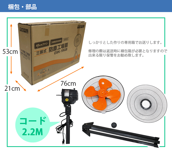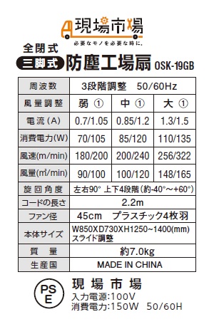 | 商品名 | 【廃番】現場市場 工場扇 45cm 開放式 三脚折りたたみ式 OSK-G 2018年モデル |