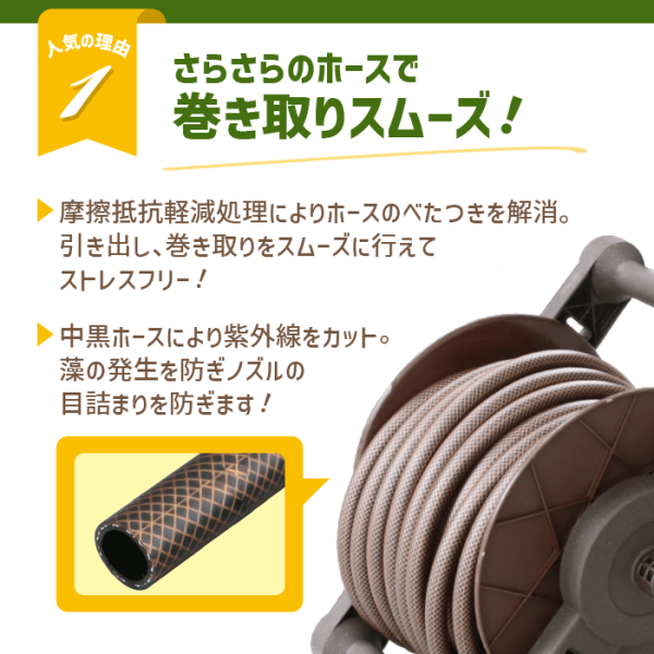 また、中黒ホースにより太陽光(紫外線)をカット、藻の発生を防ぎノズルの目詰まり防止に役立ちます。(特許登録品)