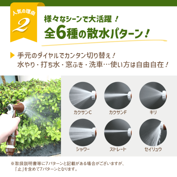 6つの水流が選べ、ロータリーコネクターによりホースのねじれを防ぎます。