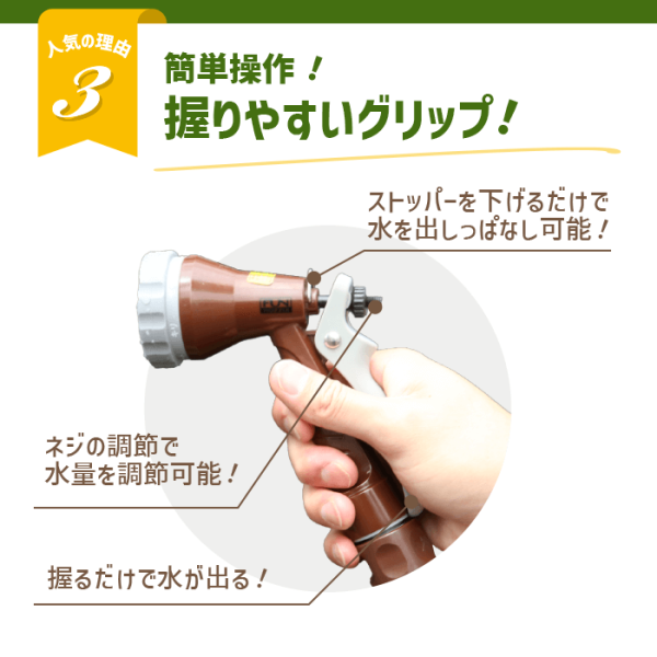 軽量・コンパクト・6つの水流が選べる多機能ノズル¨FUNノズルR¨、ホースのねじれを防ぐロータリーコネクター、ノズルをしっかり固定するノズルホルダーが装備されています。