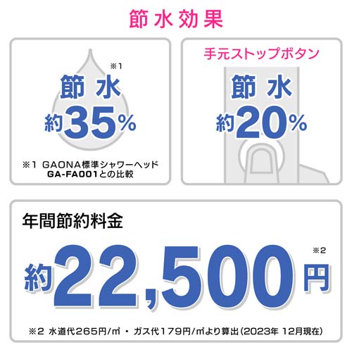 ●従来型シャワーヘッドと比べて約35%の節水効果(当社比)なので、毎日の生活で節水を意識せずに節約できます。