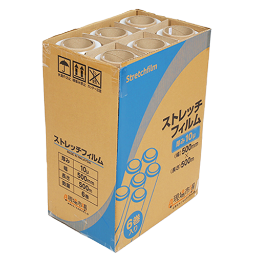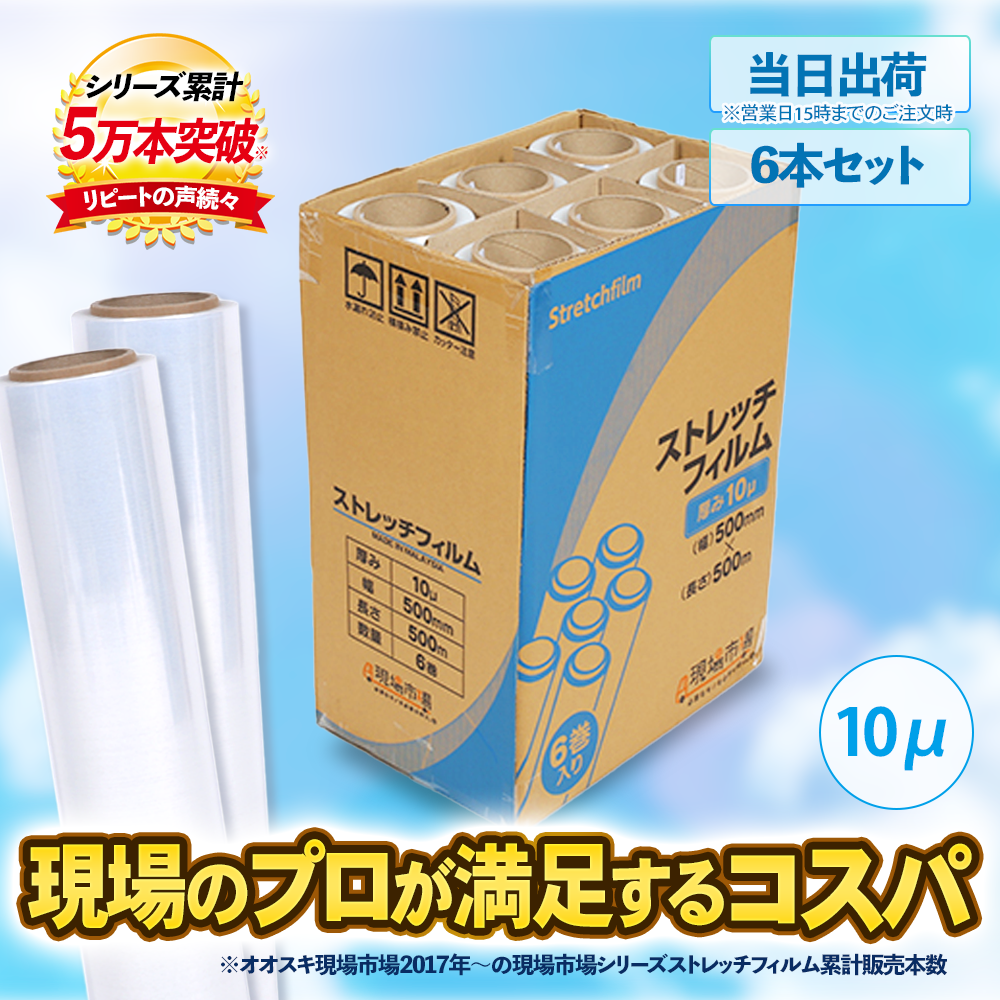 | 商品名 | 現場市場 ストレッチフィルム 10μ 500mm×500m 1箱(6巻入り) OSK-SF10 |