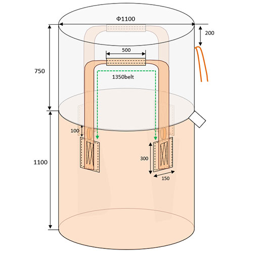 - 内容物を充填・運搬した後、反転ベルトをフォークリフトなどに引っかけてひっくり返して内容物を排出するために使用します。