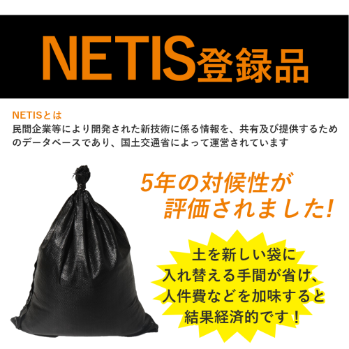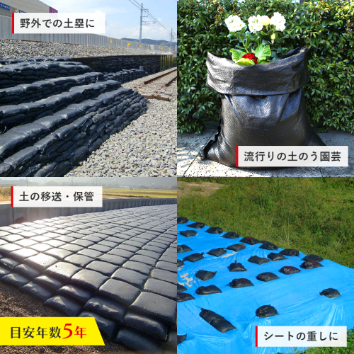 ●長期間の備蓄や被災地復興の長期使用にも耐える頼もしい国産土のうです。【用途】●長期土木工事の土塁設置、河川工事などの長期工事の土塁、災害備蓄に。