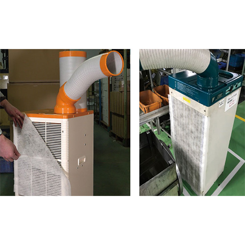 ●空気清浄効果:工場内に浮遊するオイルミストや粉塵を効果的にキャッチ。工場扇、スポットクーラー、業務用エアコンに空気清浄機能が付加されます。