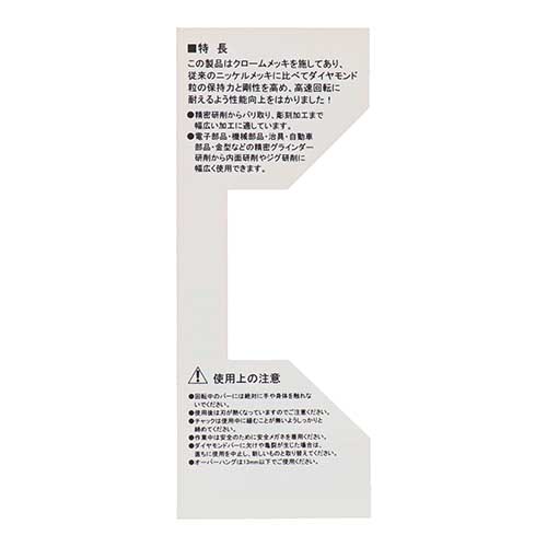 【特長】●クロームメッキを施し、従来のニッケルメッキに比べダイヤモンド粒の保持力と剛性を高め、高速回転に耐えうる性能の向上をはかりました。