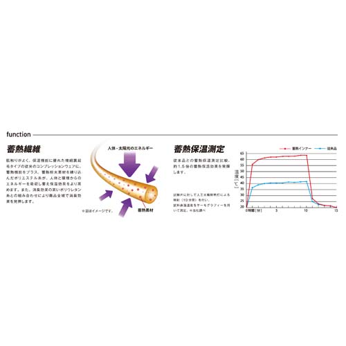 ●蓄熱粉末素材を練りこんだポリエステル糸が、人体と環境からのエネルギーを吸収し蓄え保温効果をより高めます。