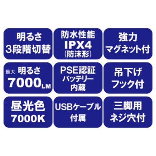 【特長】●7000ルーメン/約3時間⇔4000ルーメン/約7時間⇔1500ルーメン/約10時間、3段階の明るさ調整が可能。