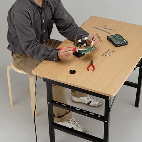 ●ワークデスク表面はハンマー等で強い衝撃を与えないでください。天板に乗っての作業や腰かけたりしないでください。必ず水平で安定した床面に設置し、ガタつきのない状態でご使用ください。絶対に改造して使用しないでください。