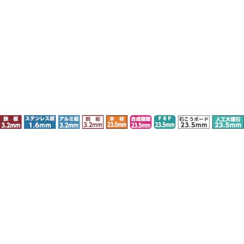 【用途】●被削材:薄鋼板(3.2mm以下)、ステンレス(1.6mm以下)、アルミ板、木材、樹脂板、FRP、金属系サイディング、石こうボード、人造大理石など。