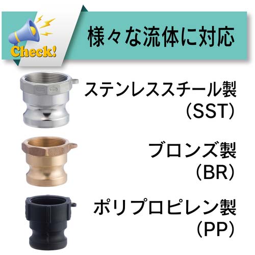 ●【様々な流体に対応】カムロックの材質は、アルミ合金・ステンレススチール・ポリプロピレン・ブロンズがあり、流体に応じて選定可能です。