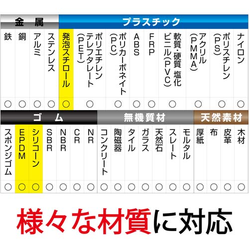●※接着できないもの:ポリエチレン、ポリプロピレン、フッ素樹脂、ポリアセタール、ナイロン、シリコーンゴム等。