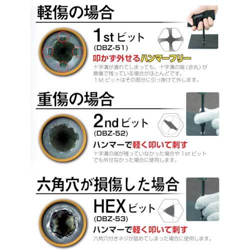 【特長】●DBZ-55の交換用ビットです。(ある程度の潰れネジであれば叩かずに、ネジを外す事ができるビットです。)