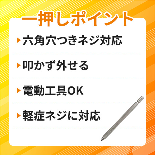 ●独自の先端形状により、潰れた六角穴付きボルトを叩かず外せます。