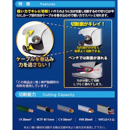 【特長】●ケーブル(VCT、IV線など)や、より線を軽い力でキレイに切れます。