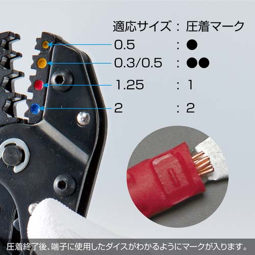 ●圧着端子([[MM2]])絶縁被覆付端子用:0.3、0.5、1.25、2