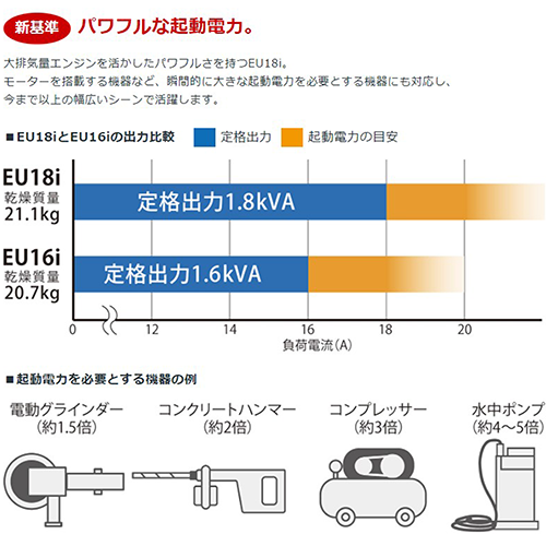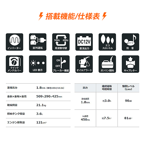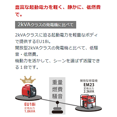 【特長】●121[[CM3]]大排気量エンジンを搭載し、コンパクトながら2kVAクラスに迫るパワフルな起動電力です。