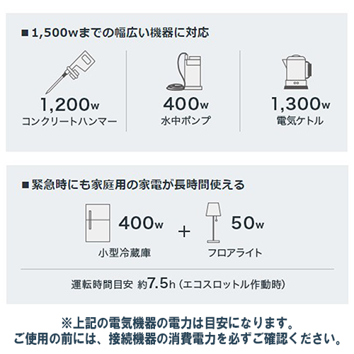 ●1.8kVAの出力で工事現場等での電動工具の使用はもちろん、幅広い家庭用の電気製品にも対応可能です。