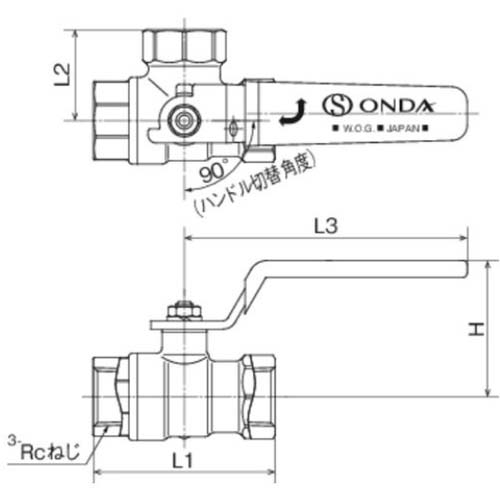 オンダ製作所 T型(三方)ボールバルブ Rc3/8 T-10