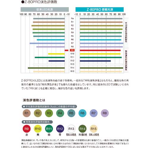●一般的な「平均演色性」はもちろん、繊細な色再現性の基準となる「特殊演色性」でも優れた再現性を持っている、色にこだわる方へのタスクライトです。