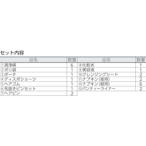 ●ヘアゴム×1個、毛抜きピンセット×1個、ヘアピン×2個、化粧水×1個、美容液×1個、クレンジングシート×2個、ナプキン(夜用)×2個、ナプキン(昼用)×6個、パンティーライナー×2個