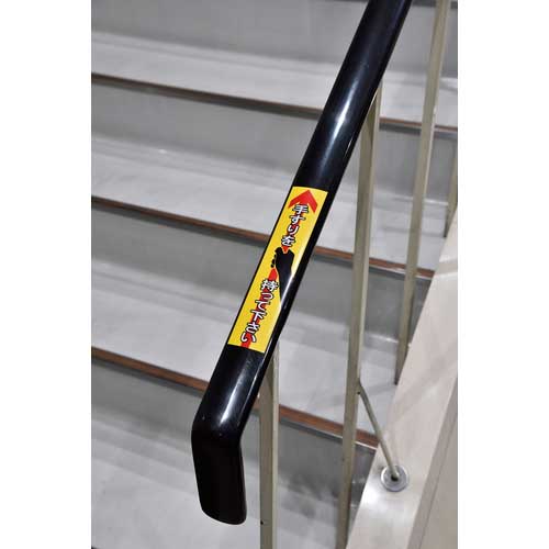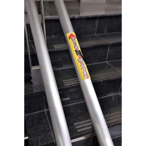 【特長】●手すりに合わせた縦長のステッカーで、文字とイラストが注意を喚起します。