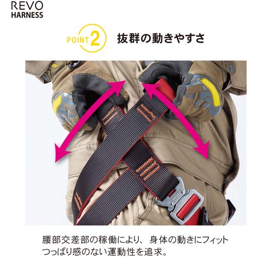 ●骨盤・足回りにベルトが配置されており、落下時に衝撃荷重を分散する上、ベルトがお尻を包み込むので救助までの持久時間が向上します。
