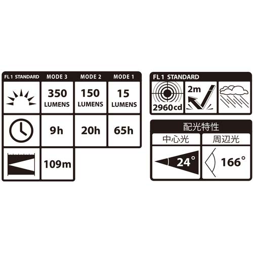 ●最大点灯時間(h):65(モード1・15lm時)/20(モ−ド2・150lm時)/9(モ−ド3・350lm時)