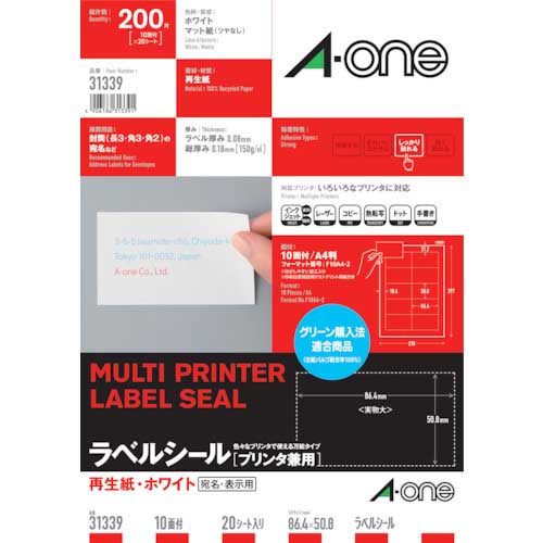 3M エーワン ラベルシール プリンタ兼用 再生紙 10面 四辺余白付 20枚 31339