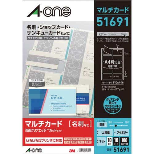 | 商品名 | 3M エーワン マルチカード 名刺用紙 フチまで印刷 クリアエッジ 両面印刷 プリンタ兼用 マット紙 アイボリー 標準 A4 10面 1袋(10シート入) 51691 |