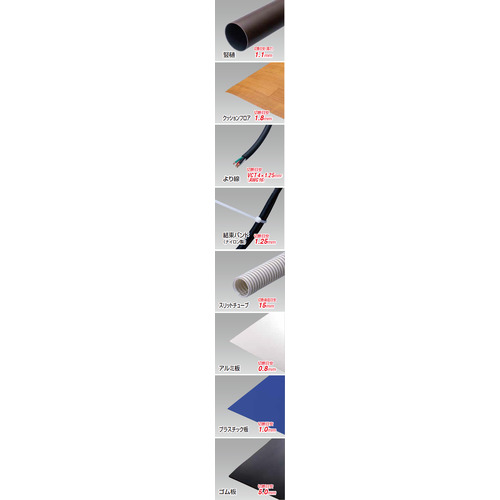 【仕様2】●切断能力:竪樋(1.1mm)、クッションフロア(1.8mm)、結束バンド(ナイロン製:1.25mm)、アルミ板(0.8mm)、プラスチック板(1.0mm)、ゴム板(5.0mm)