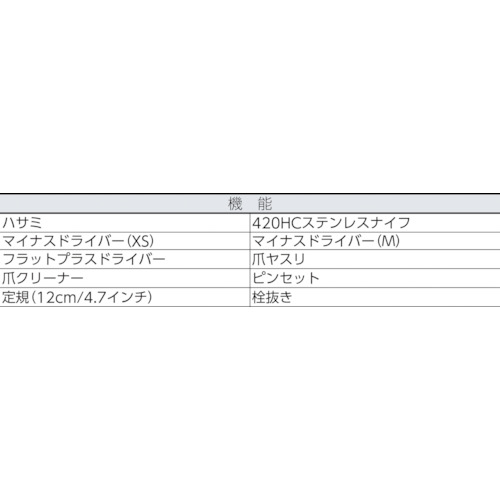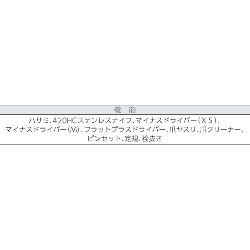 ●機能:ハサミ、420HCステンレスナイフ、マイナスドライバー(XS)、マイナスドライバー(M)、フラットプラスドライバー、爪ヤスリ、爪クリーナー、ピンセット、定規、栓抜き