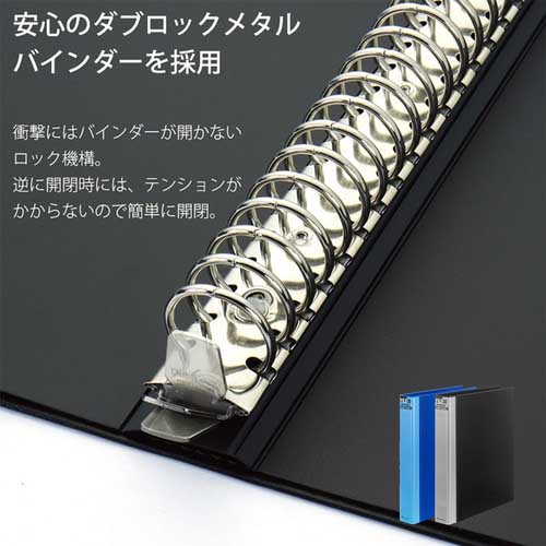 【特長】●リングをがっちりロックするダブロック機構と、水をはじく丈夫なPPくるみ表紙で大切な書類を長期間保存するのに適しています。