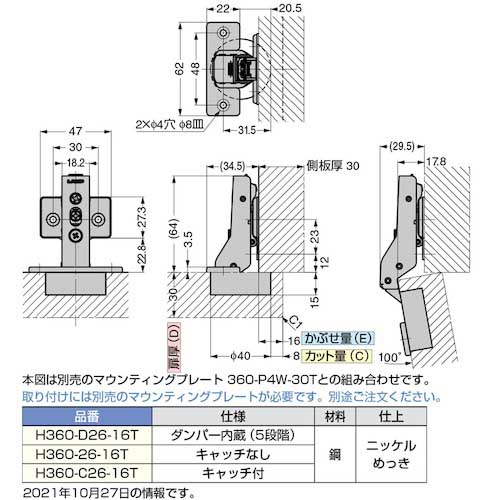 | 商品名 | SUGATSUNE (160029079)H360-C26-16Tラプコン搭載 オリンピア スライドヒンジ 厚扉用 H360-C26-16T |