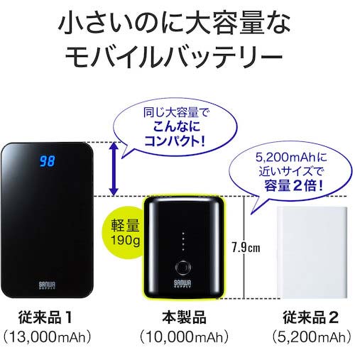 ●大容量化と小型軽量化を両立した10000mAhの携帯性に優れたモバイルバッテリーです。