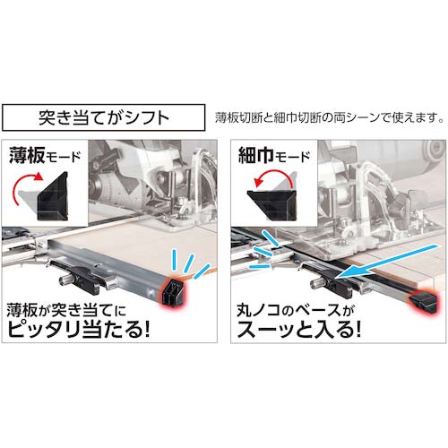 ●突き当てを倒すことで電気丸鋸のベースが隙間に入り込んで、細巾切断が可能になります。