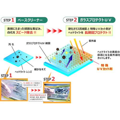 【特長】●硬化ガラス質被膜がヘッドライトを約2年プロテクトします。
