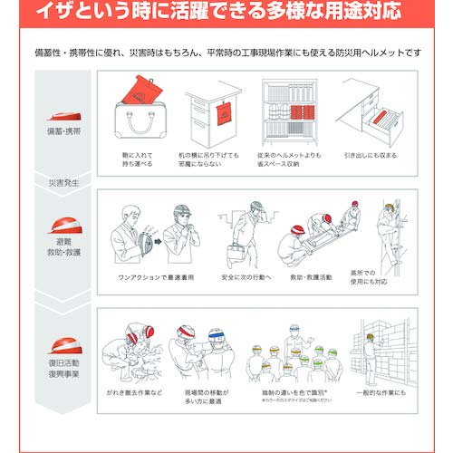 【特長】●折りたたみ式を採用し、備蓄性、携帯性に優れ、いざという時にワンタッチで装着可能です。