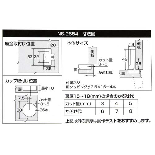 商品名 WAKI スライド丁番(半かぶせタイプ) NS‐2654 キャッチ付き 穴径26mm NS2654