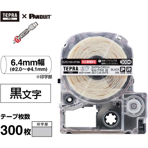 KING JIM 【純正】「テプラ」PROテープ カットラベル・パンドウィット/セルフラミネートラベル/白ラベル/黒文字 対応ケーブル径Φ2.0〜4.1mm SZS100-075K
