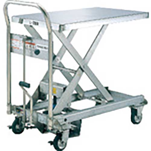 【特長】●水に強いステンレス製リフト台車です。