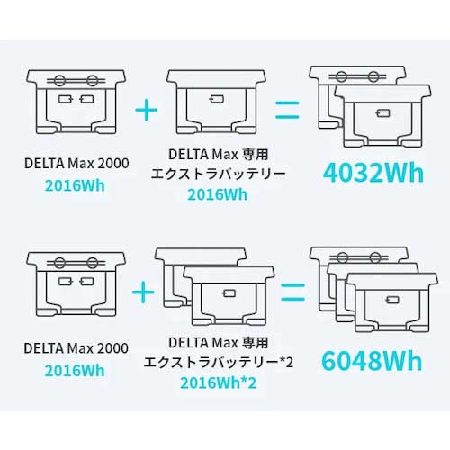 【特長】●DELTA Max2000本体と専用エクストラバッテリー最大2台を合体すると、2016Whの容量から6048Whに増加し、ニーズに合わせて容量のカスタマイズが可能です。