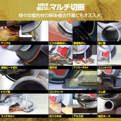 【用途】●一般鉄鋼材、ステンレス、鋼管、薄鉄板、非鉄金属、樹脂、FRP、トミジ管、塩ビ管、ダクタイル鋳鉄管、スレート建材、モルタル、コンクリート、レンガ、ゴム製品、タイル、木材(釘・ビス入り)などに。