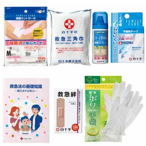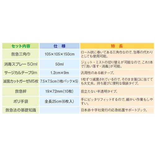 【セット内容/付属品】●救急三角巾(105×105×150cm)、消毒スプレー50mL、サージカルテープ(幅1.2cm×長9m)、滅菌カットガーゼM(7.5×7.5cm)1枚パック×5、救急絆(19×72mm)10枚、ポリ手袋(全長25cm)6枚、救急法の基礎知識ブック