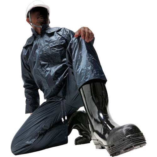 【特長】●上着は、水の侵入を防ぐ前たて、手袋使用時に便利な2重袖、収納に便利な左胸ポケット、視認性の良い透明フード、背中に反射テープ付の多機能合羽です。