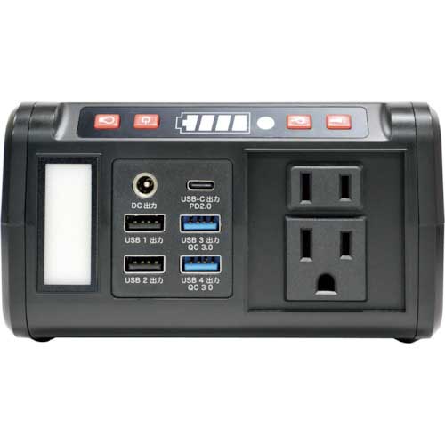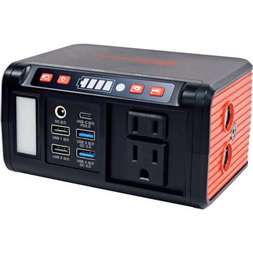 【仕様2】●出力:AC修正正弦波(2個 100V/80W:連続 120W:最大 )、DC(1個 :12〜16.8V/10A 最大13A)、USB(2個:5V〜2.4A 合計:4.8A)、USB QC3.0(2個:5〜12V/2A、最大18W、合計最大:5V/3.4A)、USB-C 1個(5V/3A、9V/2A、12V/1.5A、PD2.0、最大18W)
