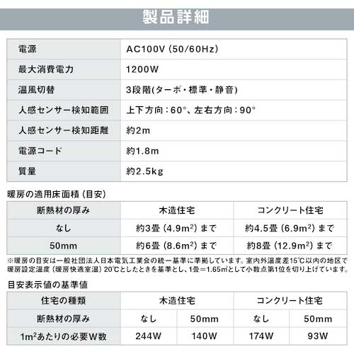 ●適用床面積(目安):50Hz 木造約3畳/コンクリート約4.5畳、60Hz 木造約3畳/コンクリート約4畳
