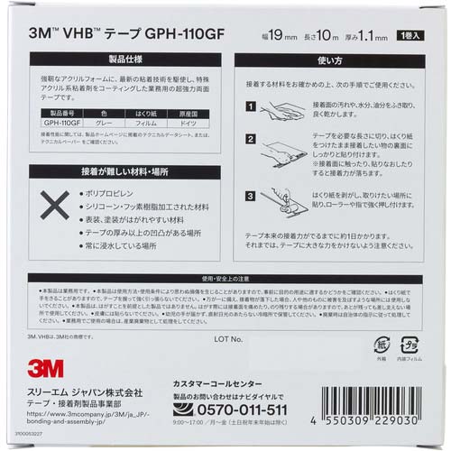 | 商品名 | 3M VHBテープ GPH110GF 19mmX10m 高耐熱・汎用 19X10 BOX |