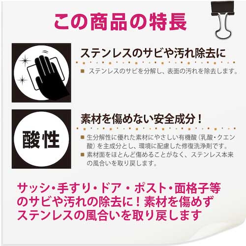 【用途】●ステンレス手摺、ステンレスサッシ、ステンレスの看板・メールボックス等のサビや汚れの除去。