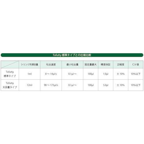 【特長】●シリンジに充填できる量がTofuttyの12倍(12mL)です。